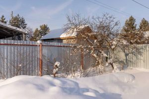 Участок огорожен по периметру забором -из профнастила.