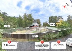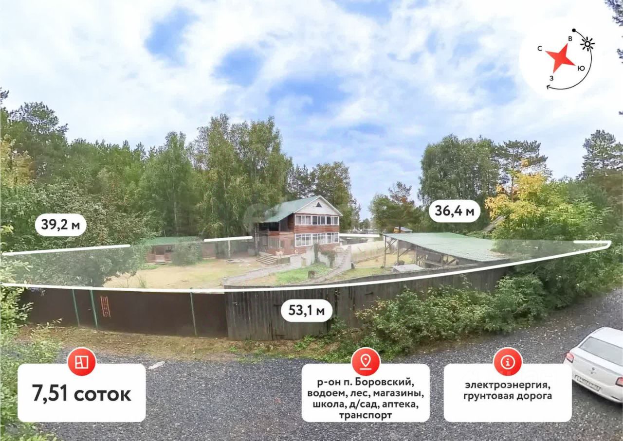 Земельный участок площадью 7.5 сотки, расположен в живописном месте не далеко от поселка Боровский, в непосредственной близости от соснового леса и озера Андреевское. Территория полностью огорожена капитальным забором, что обеспечивает абсолютную конфиденциальность и безопасность. Наличие въездных ворот и бетонированной площадки под навес позволяет разместить несколько автомобилей.