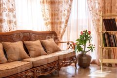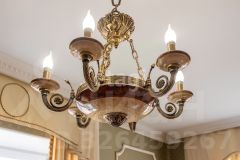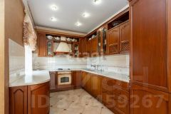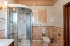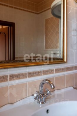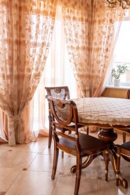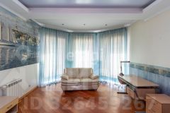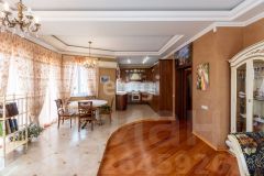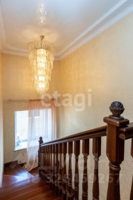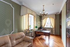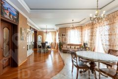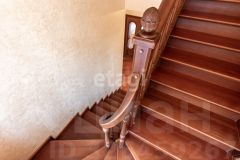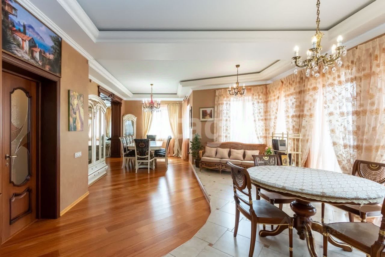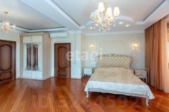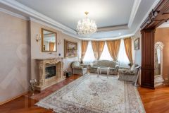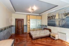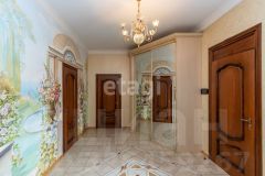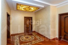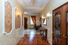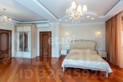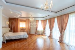кв.м., три спальных комнаты площадью от 22 до 26 квадратных метров и совмещенный санузел. В цокольном этаже находятся прачечная, гардеробная, спортивный зал, кладовка и бытовая комната. Неповторимая прихожая с авторской росписью стен, текстильные декоративные панно, зеркальные шкафы-купе с пескоструйным рисунком, комбинированные потолки с встроенными многочисленными светильниками, модные современные текстильные обои на стенах из натурального, экологически чистого текстиля, фото обои, паркет из карельской березы, потолочный витраж "Тиффани", переливающийся всеми цветами радуги и наполняющий интерьер особым светом, мраморные подоконники, двери и лестницы, выполненные из натурального итальянского шпона, делают интерьер неповторимым и оригинальным. Теплый коридор соединяет коттедж с гостевым домом, изюминкой которого является многоуровневый 40-кубовый бассейн с потолочной подсветкой.