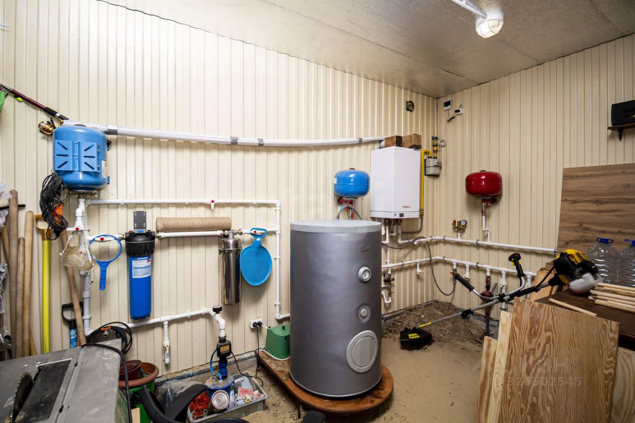 Да, также имеется на участке отдельно стоящая котельная + используемая как хоз блок. В котельную заведён газ, и в ней находятся, котёл (24кв с запасом ещё на один дом или баню), распределительный коллектор отопления (выведен контур для бани), бойлер косвенного нагрева 200л, скважина 33метра, фильра очистки воды.