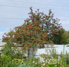 Плодовые деревья и кустарники: три яблони, рябина, ирга, калина, а также сосна, береза, розы и пионы.
