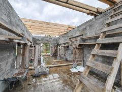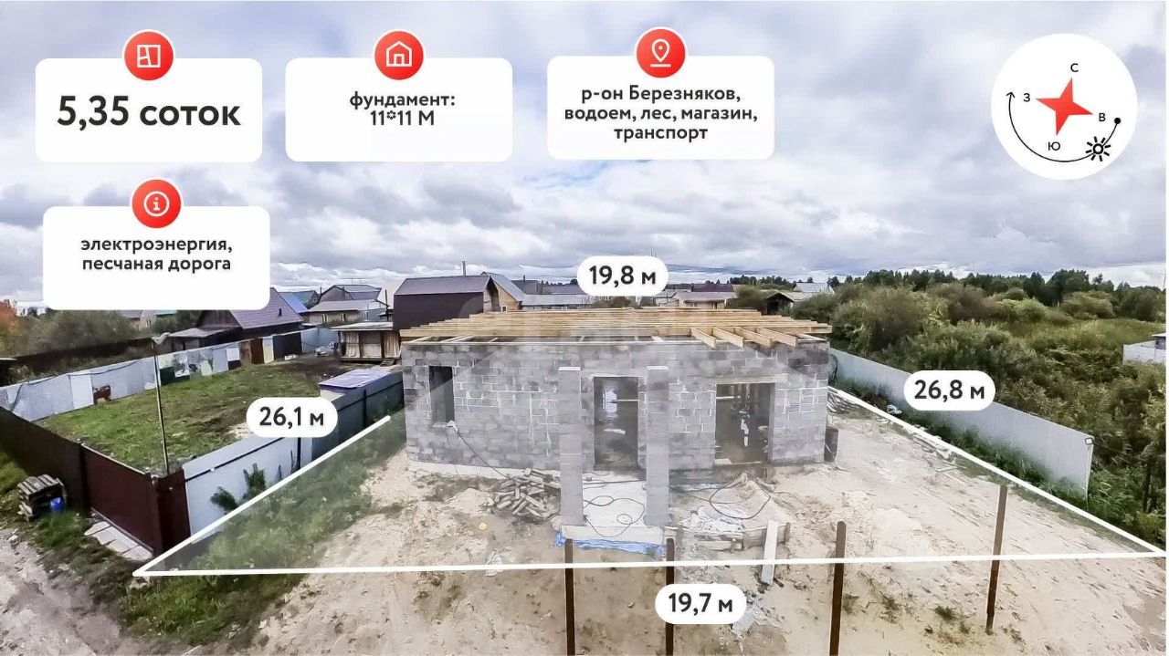 На территории имеется прочный фундамент под дом размером 11х11 метров и возведены стены, что позволит вам сразу приступить к строительству. Участок обеспечен центральным водопроводом и электричеством, что значительно упростит процесс подключения и эксплуатации.