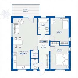 Просторная кухня-гостиная площадью 30 кв.м., две спальни по 12 кв.м., кладовая, санузел, котельная.