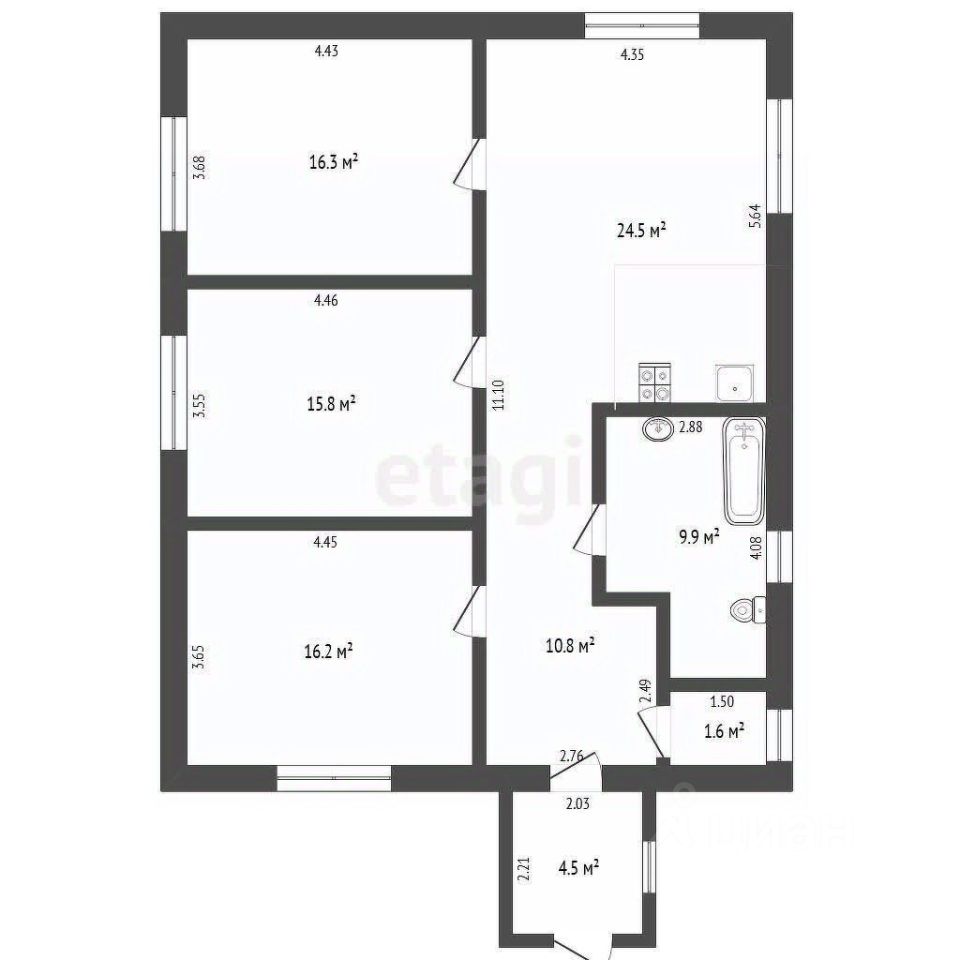Три светлые спальни по 15 кв. мУютная кухня-гостиная площадью 20 кв. м Большая ванная комната, отделанная кафелем