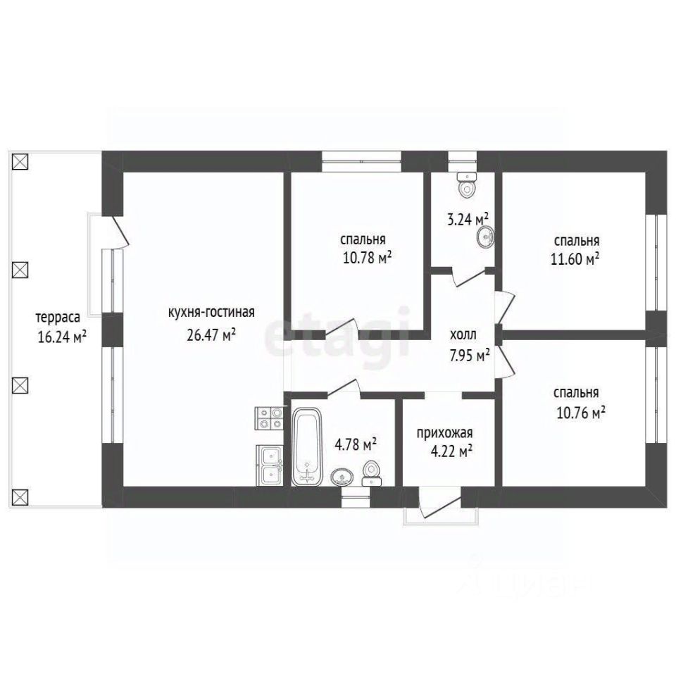 В доме 3 просторных спальни по 10-11 м2, просторная кухня-гостиная 26.47м2 с выходом на террасу 16м2, ванная комната 4.7 м2, прихожая 4.2 м2, а также котельная 3.2 м2, с заведенным электричеством 15 кВ, 380 В, бойлером, местом под газовый котел (газ в перспективе), скважиной (30м). В котельной предусмотрен выход под центральную воду (ее обещают подключить уже в 2026г.)