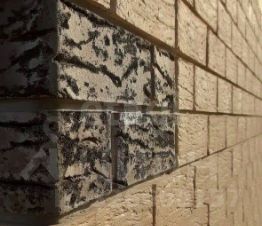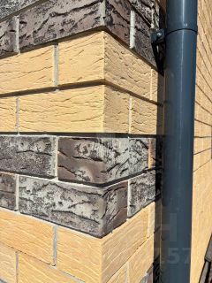 Облицован лицевым керамическим рустированным кирпичом М150 ВЗКСМ (не путать с силикатным кирпичом).