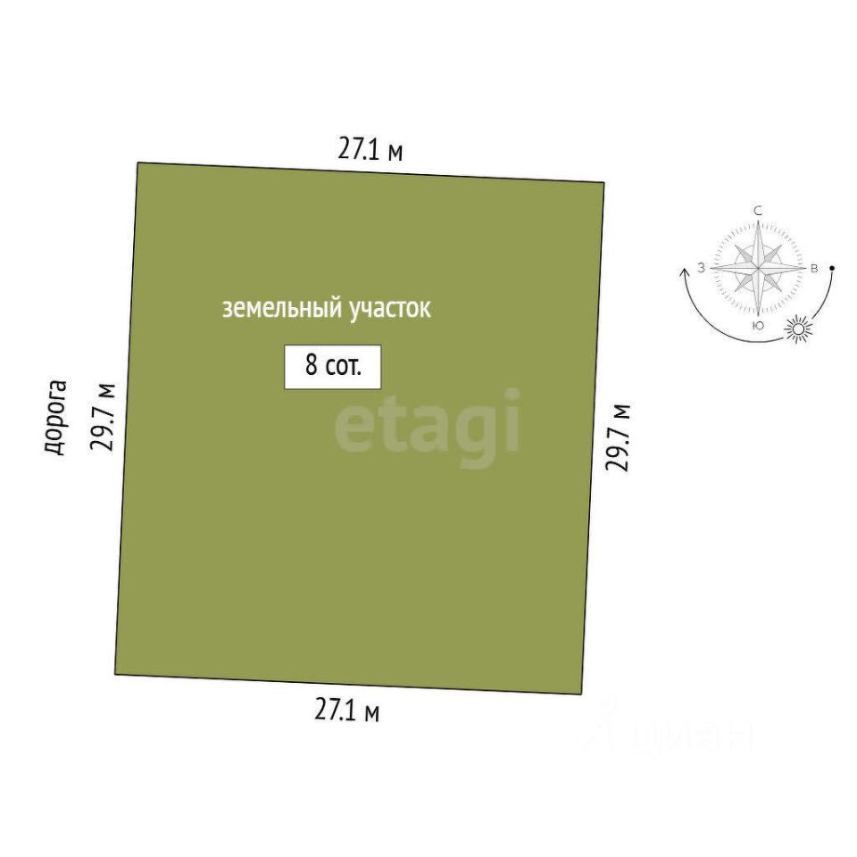 Участок 8 соток, правильной прямоугольной формы. Без построек.