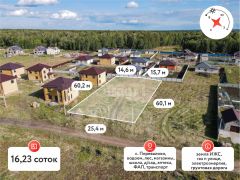 Участок площадью 16 соток (25х60 метров) находится в новой нарезке. Рядом уже построены ухоженные и красивые дома, что говорит о благоустроенности района.