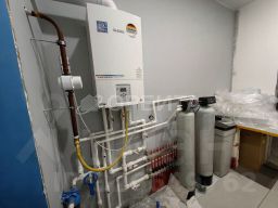 Выведены все коммуникации, система теплого пола, газовый котел отопления, нагревательный котел, установлена фильтры грубой очистки воды.