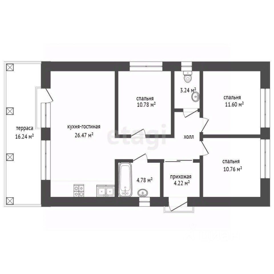 В доме 3 просторных спальни по 10-11 м2, просторная кухня-гостиная 26.47м2 с выходом на террасу (есть варианты домов с уже выполненной террасой 16м2), ванная комната 4.7 м2, прихожая 4.2 м2, а также котельная 3.2 м2, с заведенным электричеством 15 кВ, 380 В, бойлером, местом под газовый котел (газ в перспективе), скважиной (30м). В котельной предусмотрен выход под центральную воду (ее обещают подключить уже в 2026г.)