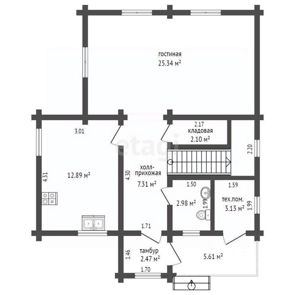 Первый этаж - кухня гостиная, вместительная кладовая. На втором этаже 3 спальни и гардеробная.