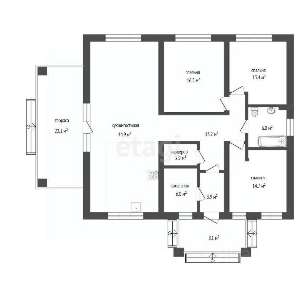 Просторная кухня-гостиная 44,9 кв.м с выходом на террасу и подсобное помещение- котельная 6 кв.м.