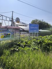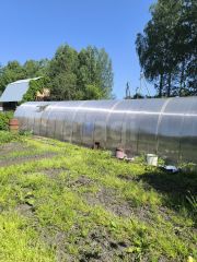 дом, баня, туалет, теплица. участок окружён по периметру забором из профнастила, с соседями - сетка.