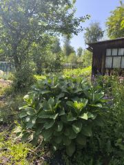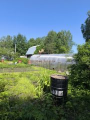 Яблони, Малина, смородина, вишни, клубника, многолетние цветы, большая теплица для огурцов и помидоров.