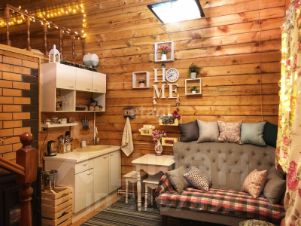Сам домик полутороэтажный, на первом этаже расположена кухня со спальным местом, а также вход из сан/узла тёплого в сауну. В доме остается всё как на фото, исключая личные вещи и холодильник с микроволновкой.