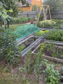 Участок полностью благоустроен: дорожки выложены плиткой и брусчаткой, установлен большой стационарный мангал. Земля разработана и удобрена, здесь высажены плодоносящие яблони, вишни, кусты смородины, крыжовника, малины, а также грядки с клубникой и земляникой. Водоснабжение автономное, из собственного колодца с кварцевым песком для естественной фильтрации; от него проложен летний водопровод к дому, бане и террасе, обеспечивающий достаточный объем воды для всех нужд. Внутри участка организована парковка на 3-4 автомобиля. Важным преимуществом является наличие газовой магистрали вдоль границы территории.