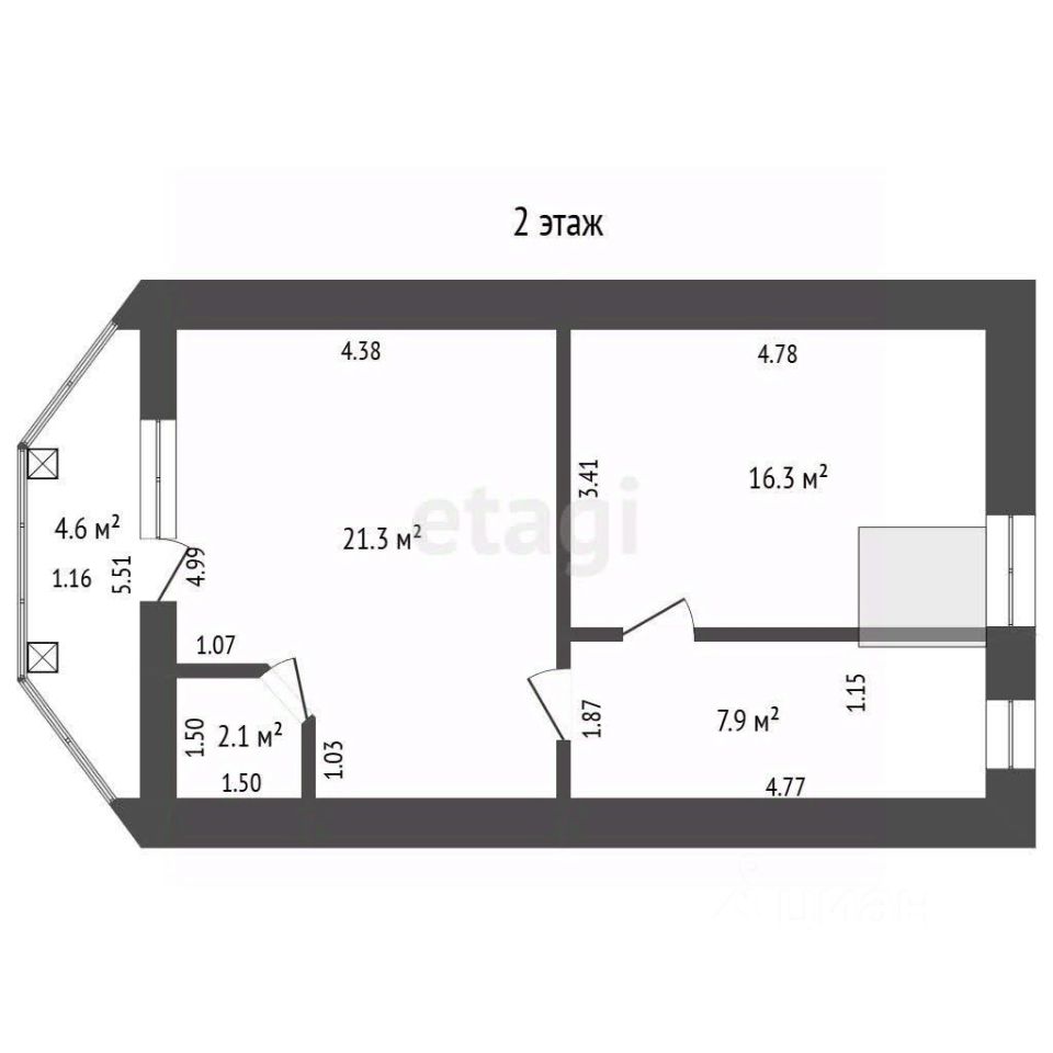 • 2 этаж: комната (21 кв.м.), детская комната (16,3 кв.м.)
