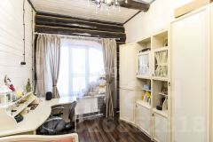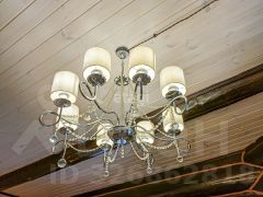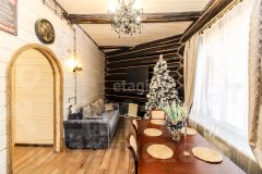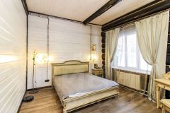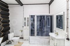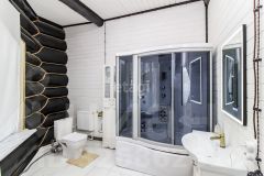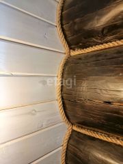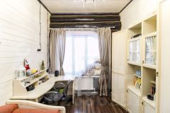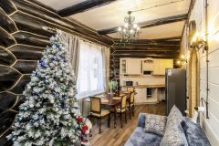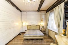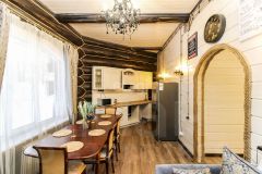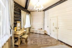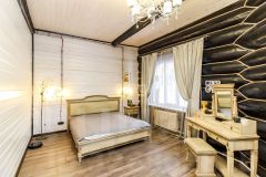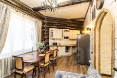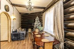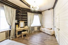 Интерьер: Стены из бревен — тонированы в благородный оттенок венге. Межкомнатные перегородки — белёные, создают контраст и лёгкость. Потолки обшиты деревянной вагонкой и декорированы темными балками. Полы — качественный ламинат; в санузле — керамогранит.