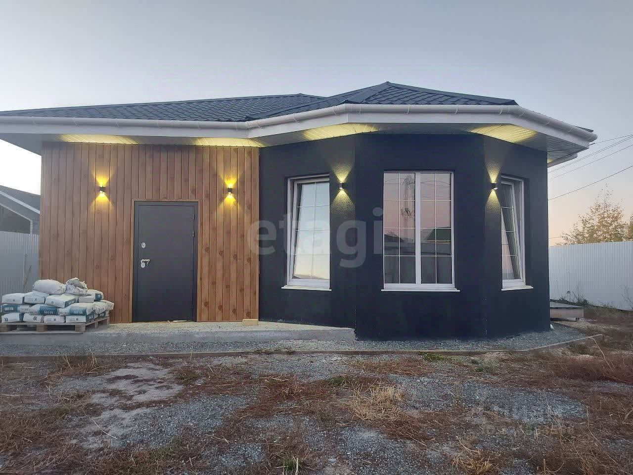 Продается новый дом в современном дизайн-проекте. Дом построен из силикатного блока с утеплителем и фасадной штукатуркой. В доме комфортная планировка - кухня-гостиная 25 кв.м, две спальни (14 кв.м и 18 кв.м), котельная, гардеробная, раздельный санузел. Высота потолков 3 м, заниженные окна, в гостиной эркер и панорамный выход на террасу. Крыша двускатная с водостоком по всему периметру. По фасаду вокруг дома уличная подсветка. Входная дверь с гидроразрывом. Забор из профнастила, откатные автоматические ворота. парковка и въезд отсыпаны и утрамбованы. В зоне отдыха терраса из дерева. Есть новая баня-бочка. В дом заведены все коммуникации: септик, скважина, электричество (разведено по дому розетки и выключатели), котел электрический в котельной, есть возможность подключения к газу. Коттеджный поселок востребован, 5-7 минут до центра города, в 2 минутах школа, детский сад, в самом поселке по проекту строительство этих объектов в будущем есть. Ходит городской транспорт. Асфальтированные дороги. 80% поселка застроено и заселено круглогодично. Подходит под ипотеку и маткапитал.