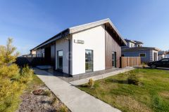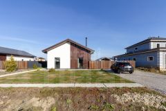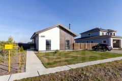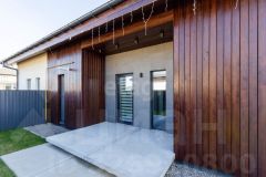 Фасад отделан декоративной штукатуркой и лиственничным планкеном.