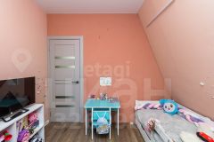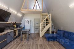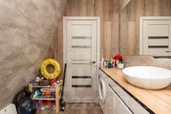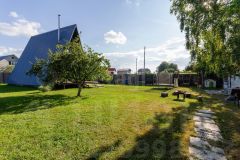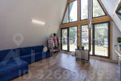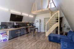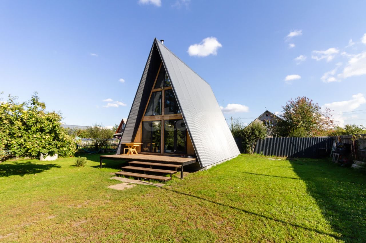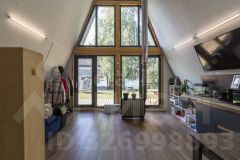 Дом выполнeнный в стилe А-фрейм. На первом этаже просторная кухня - гостиная, детская комната и сан узел. На втором этаже тоже комната, пирила уже доделаны (стоит кровать).