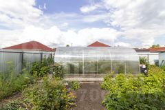 Теплица размером 3х6 метров и хозяйственный блок для хранения инструментов.Участок отсыпан,