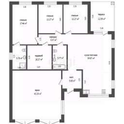 В доме три комнаты: Просторная мастер-спальня с просторной гардеробной для родителей и сансузлом и две равноценные комнаты поменьше, которые можно использовать как детские или кабинет. Большие окна выходят на три стороны света, окна Rehau, значит сдесь всегда будет светло, уютно и тепло. В проекте предусмотрено два санузла и тех помещение с доступом как с улицы так и с внутренней части дома.