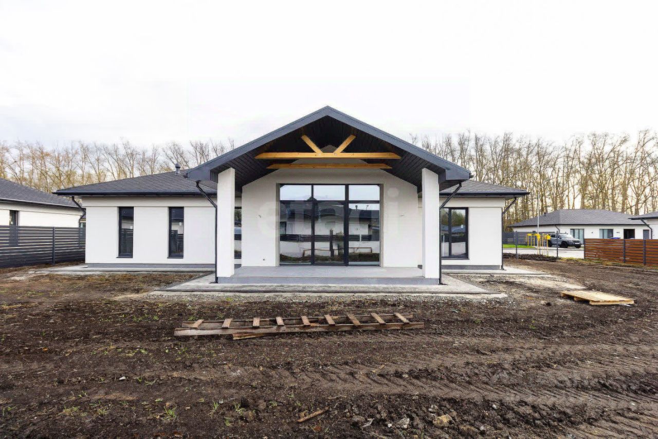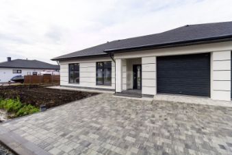1-но этажный, 171,7 м. Кв. на 3+ комнаты, с большой кухней-гостинной, с 2мя гаражами и благоустроенной дворовой и придворовой територрией.