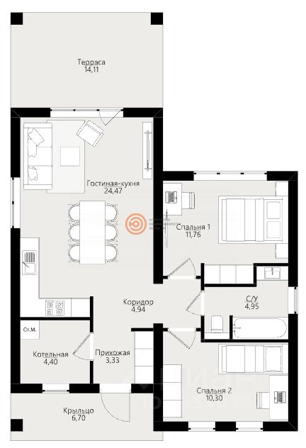 просторная кухнягостиная (19,73 м²) с выходом на террасу — идеальное место для семейных вечеров;