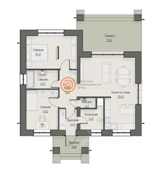 Планировка 2+. В нем просторная кухня-гостиная с выходом на террасу, 2 спальни, 2 санузла.