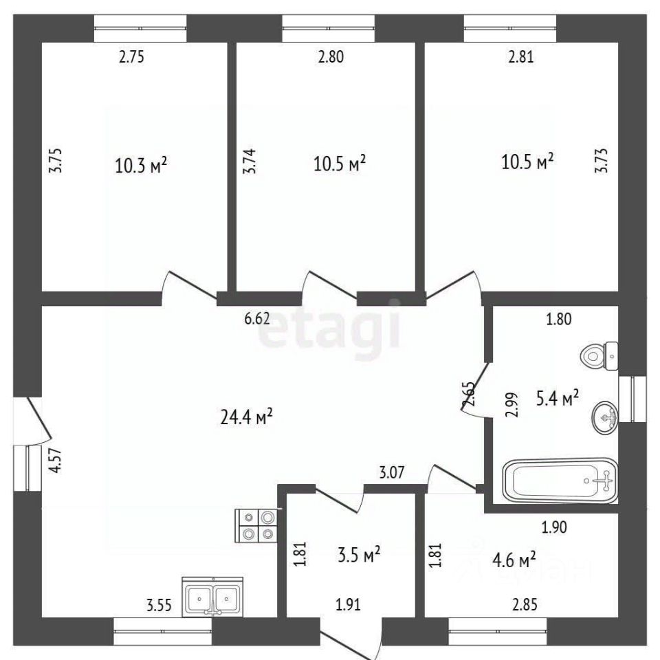 Формат 3+, 3 изолированных спальни правильной формы и просторная кухня-гостиная для теплых семейных вечеров.