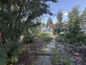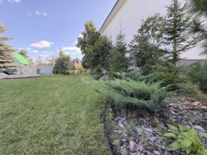 Участок демонстрирует образец профессионального ландшафтного дизайна: здесь проложены дорожки из брусчатки, разбит газон, организованы зоны с декоративной корой.