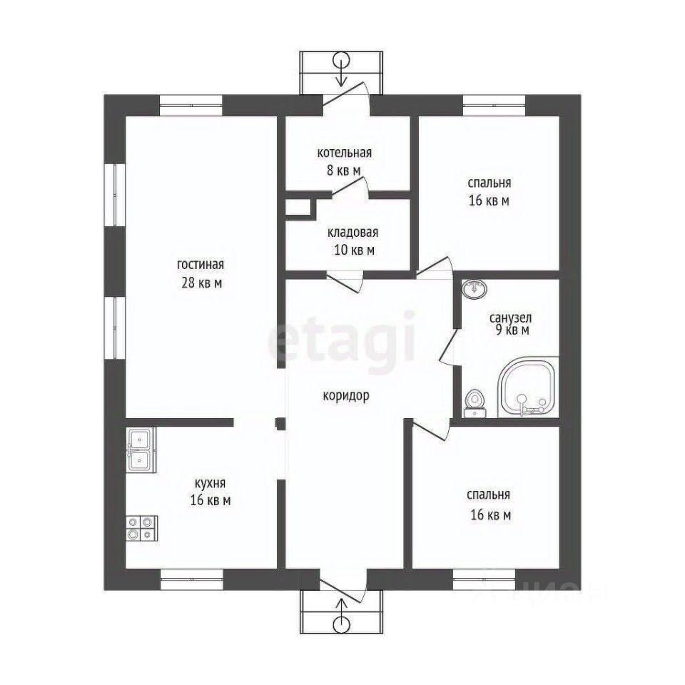 Имеется кладовая 10 кв.м, котельная 8 кв.м, санузел 9 кв.м, прихожая 14 кв.м.