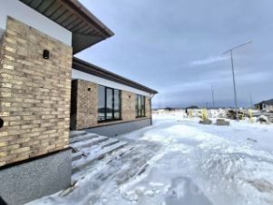 Планировка дома функциональная, при входе со стороны двора справа располагаются: ниша для шкафа - купе; далее просторная гардеробная комната; слева один из входов в гараж; котельная 6,53 м2 с доступом в гараж. По центру дома огромная гостиная 28,85м2, с двумя окнами в пол и выходом на террасу; к ней слева примыкает кухня 12,95 м2; направо санузел, три квадратных спальни с окнами на две стороны; ванная комната 4,1 м2. По периметру дома теплый пол, также имеется возможность установки радиаторов. Входная дверь Торекс с терморазрывом.