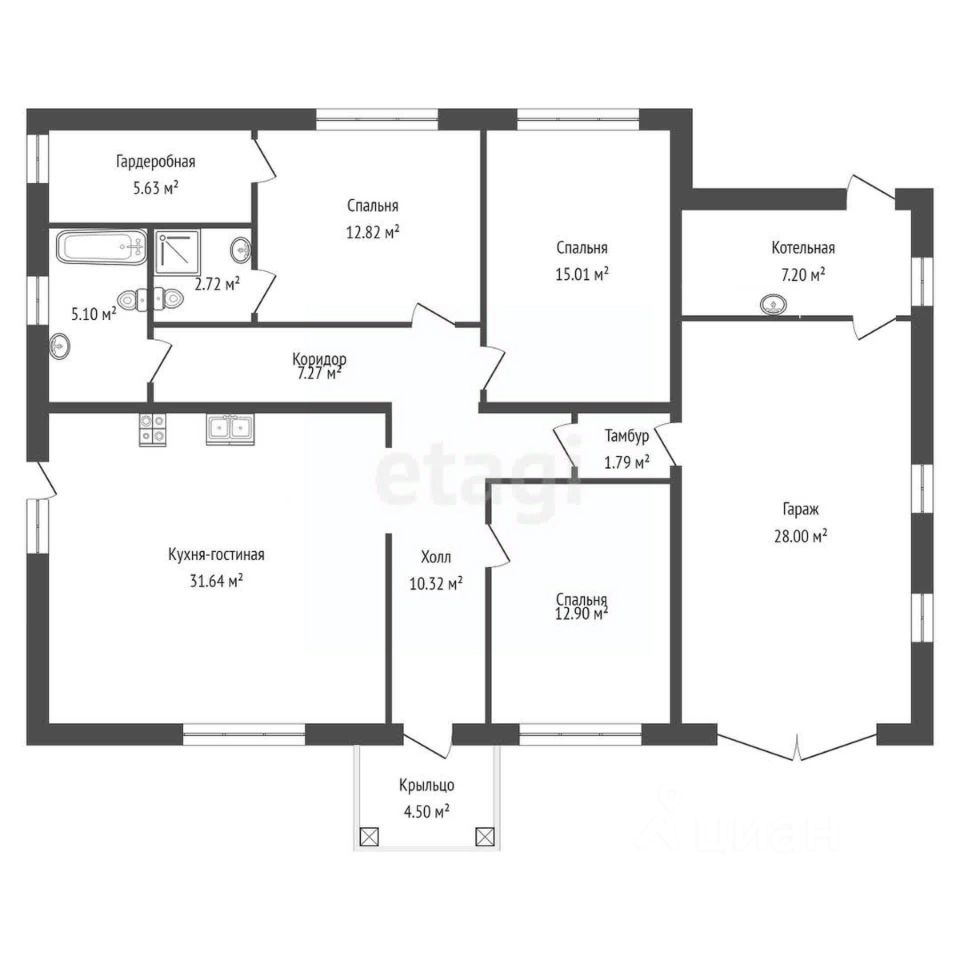 Планировка включает: большую кухню-гостиную, три просторные спальни, котельную, большой сан. узел, гардеробную. Дом продается с улучшено-черновой отделкой, стены выровнены, заштукатурены, все коммуникации протянуты,дом готов для Ремонта Вашей Мечты!.