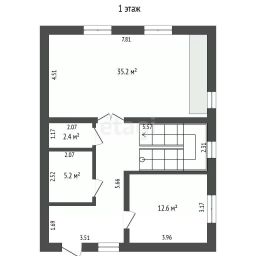 В доме на первом этаже: кухня - гостиная 35м2, спальня 12.5м2, ванная комната и котельная.
