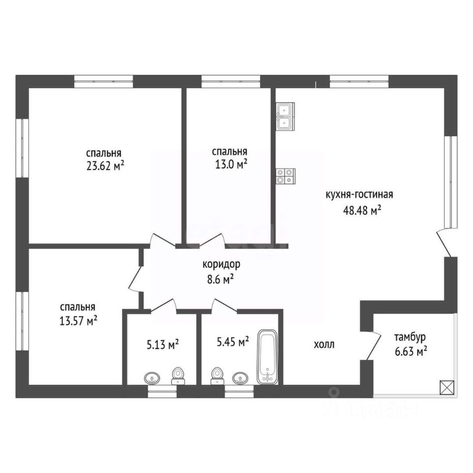 - Функциональная планировка, включающая кухню-гостиную и три изолированных спальни правильной геометрической формы,