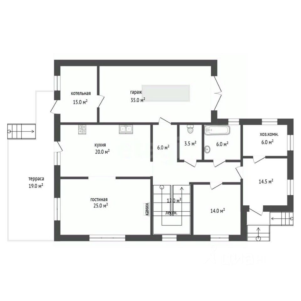 1й этаж: просторная входная зона, спальня, ванная, туалет, кухня (с подсобным помещением), гостиная с камином, выход на террасу, вход в бойлерную и гараж.