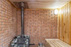 Парилка, душ и уютная зона отдыха с качественной отделкой — керамогранит с подогревом, дерево, кирпичная стена у топки.