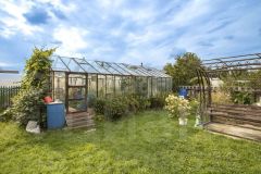 Капитальная стеклянная теплица на алюминиевом каркасе. Ухоженный кирпичный дом (можно переоборудовать), качели, плодовые кустарники, виноград. Парковка выложена брусчаткой.