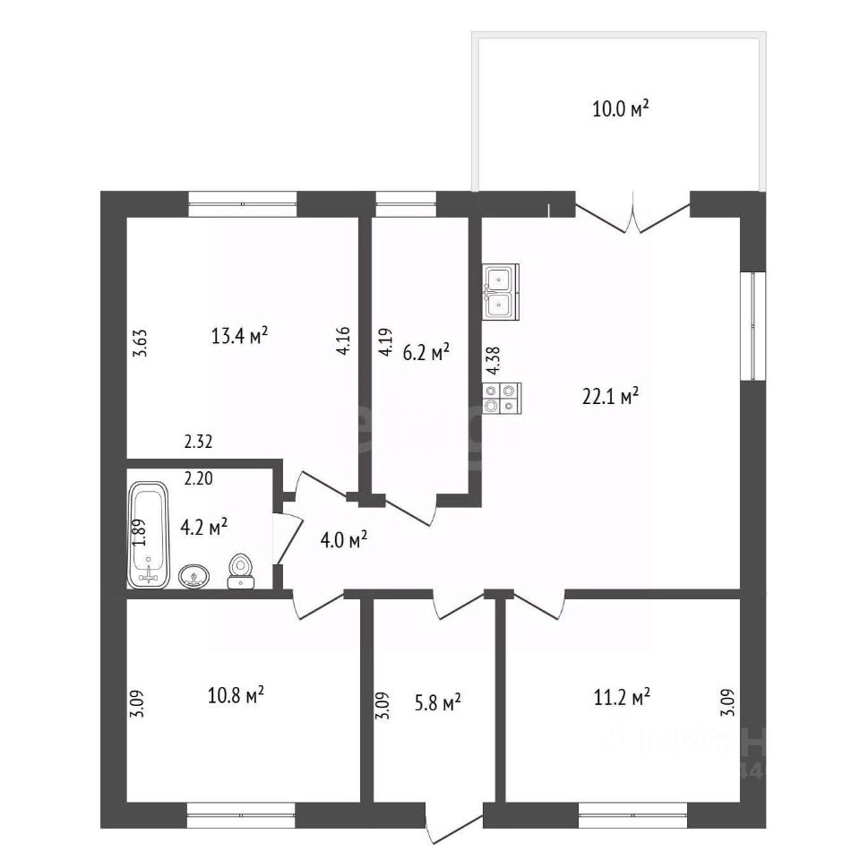 Фундамент выполнен из монолитно утепленной плиты с отмосткой, что гарантирует надежность и долговечность конструкции. Большие окна от компании Rehau наполняют комнаты солнечным светом, а теплые полы обеспечивают комфорт в любое время года. В доме есть электричество, скважина глубиной 38 метров и септик на 10 кубометров. Планировка включает просторную кухню-гостиную и три комнаты правильной квадратной формы.Также имеется просторная терраса площадью 10 кв.м.