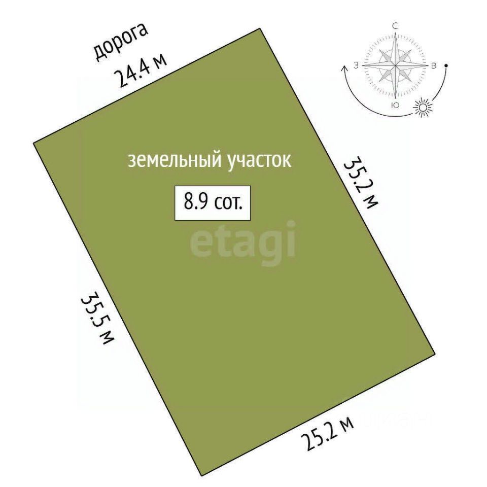 Участок уже огорожен, размежован 8.88 сотки (25 на 35 метров).