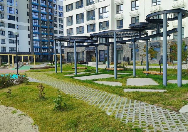 Закрытый благоустроенный двор: аккуратные дорожки, детская и спортивная площадки, зелёные насаждения и зоны отдыха.