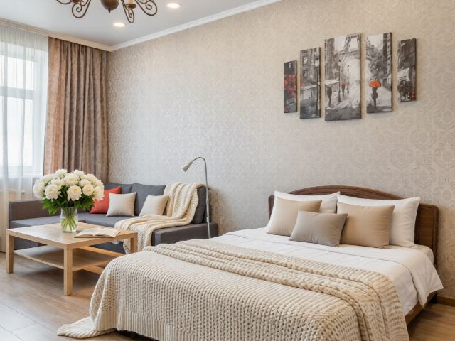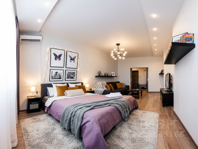 -Просторная комната и кухня гостиная. 6 (2+2+2) комфортных спальных места. В комнате большая двуспальная кровать и раскладной диван, на кухне еще один раскладной диван.