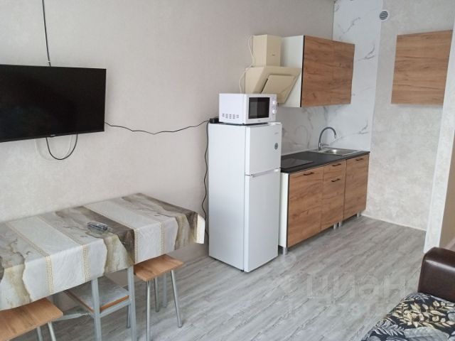 вытяжка, плита электрическая, микроволновая печь, духовки нет, есть вывод под тв на стене. Чайник, диван, обеденный стол