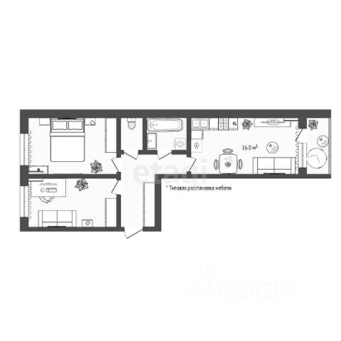 - спальная зона с кроватью 160*200, дополнительное место — раскладной диван 160*200.