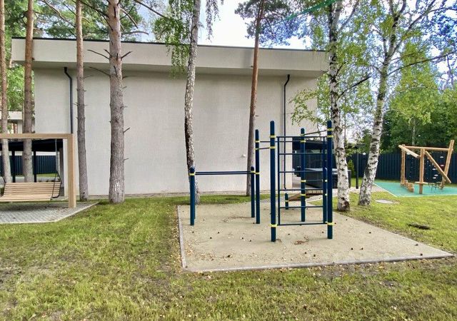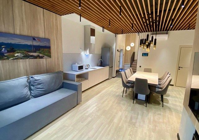 Четырехуровневый коттедж с просторной огороженной территорией, парковочными местами, зонами отдыха, мангальной зоной, саунами и бассейном.