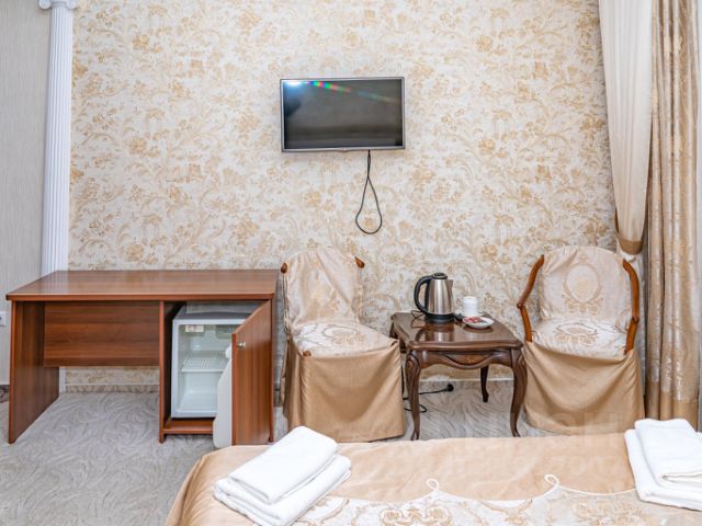 Отель в самом центре Тюмени, в 5 минутах от усадьбы Колокольниковых. Краевой музей находится в 1 км, Свято-Троицкий мужской монастырь — в 2 км, театр Драмы — в 3 км. Расстояние до железнодорожного вокзала составляет 2 км, а до аэропорта — 14 км. Это отличный вариант туристического и семейного отдыха. Гостям предлагают для размещения 15 комфортабельных номеров Стандарт, Улучшенный и Полулюкс. Во всех есть кондиционер, телевизор, комфортное рабочее место и собственная ванная комната с туалетно-косметическими принадлежностями. В уютном баре по утрам предлагают вкусные завтрака по системе "шведский стол", всегда есть свежезаваренный кофе, чай и соки. В отеле царит домашняя уютная атмосфера, благодаря тому, что отель был реализован одной большой семьей. Особый интерес представляет картинная коллекция семьи, украшающая холлы и номера отеля, состоящая исключительно из авторских работ талантливых российских и зарубежных художников. В номере: двуспальная кровать, кресло, телевизор, кондиционер, холодильник, ванная комната.