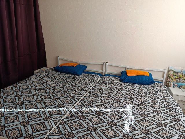 В номере три односпальные кровати, диван, журнальный столик шкаф, стул, тумба, кондиционер, чайник.