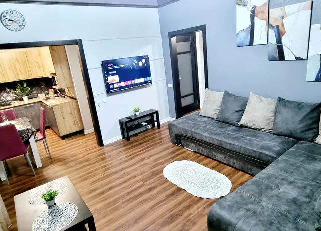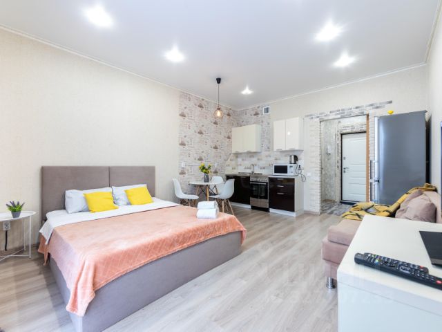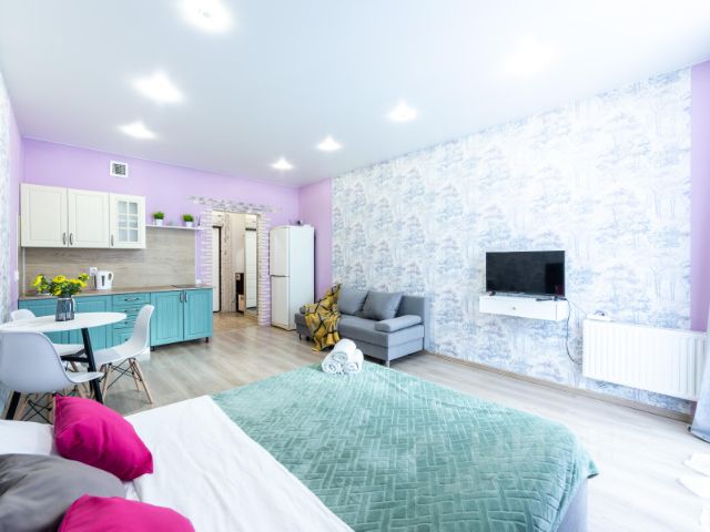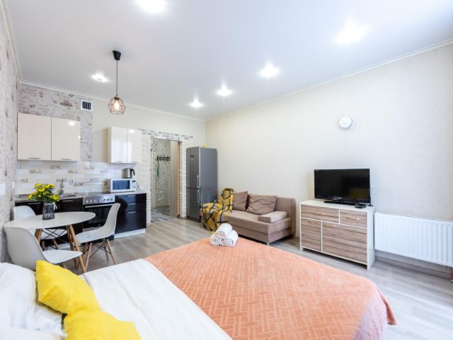 Апартаменты оснащены всеми удобствами для комфортного проживания: Холодильник, микроволновая печь, кухонная утварь и принадлежности, сан-узел с ванной, стиральная машина, утюг, фен, Wi-Fi, телевизор, постельное белье и полотенца, большая двуспальная кровать, раскладывающийся диван в гостиной, вместительный шкаф для верхней одежды